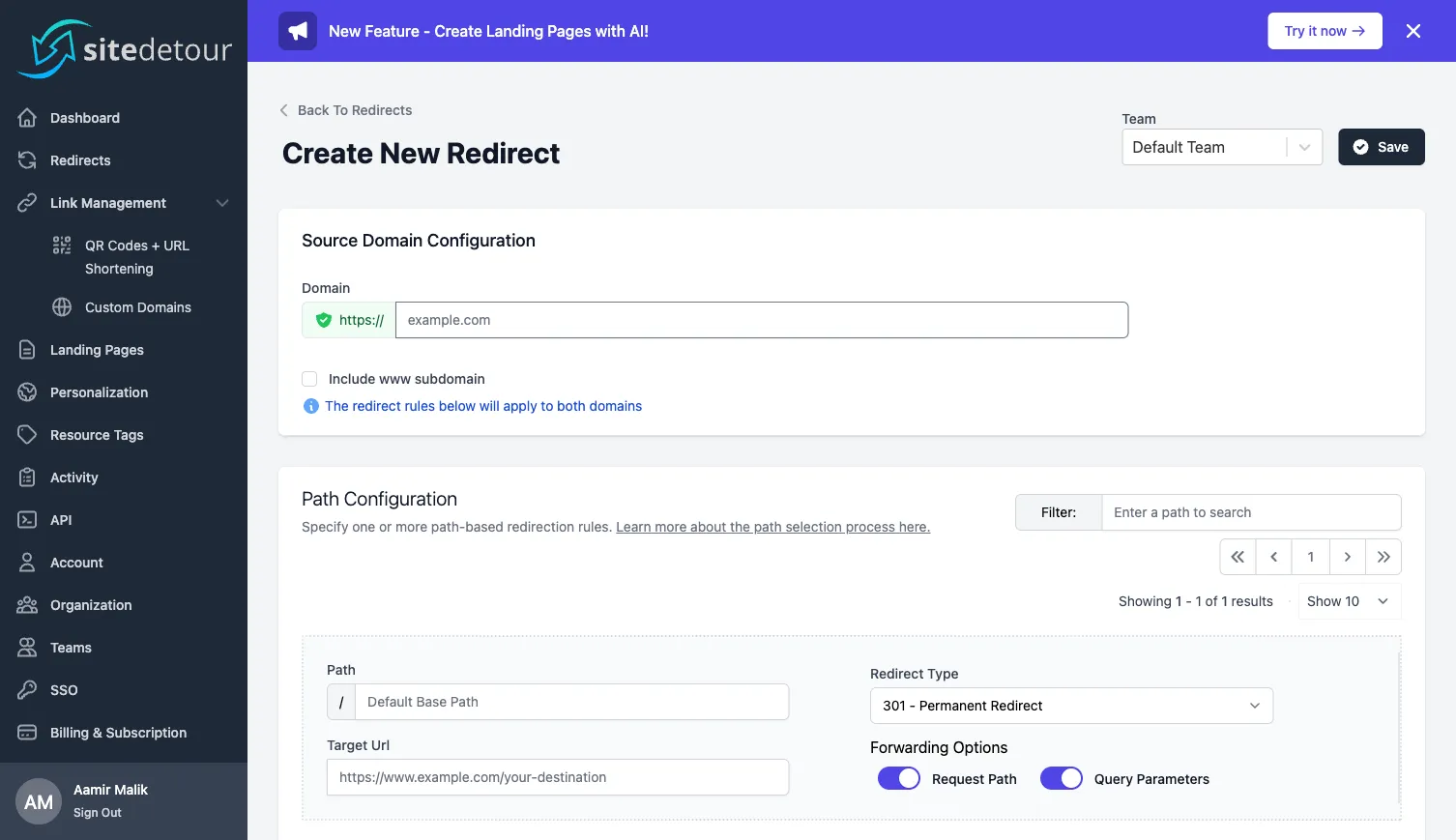 A SiteDetour redirect maps incoming requests from a source domain (or subdomain) to one or more target URLs, evaluated by a set of path rules. This article walks through the end-to-end setup: creating the redirect record, pointing DNS, and acquiring an SSL certificate.