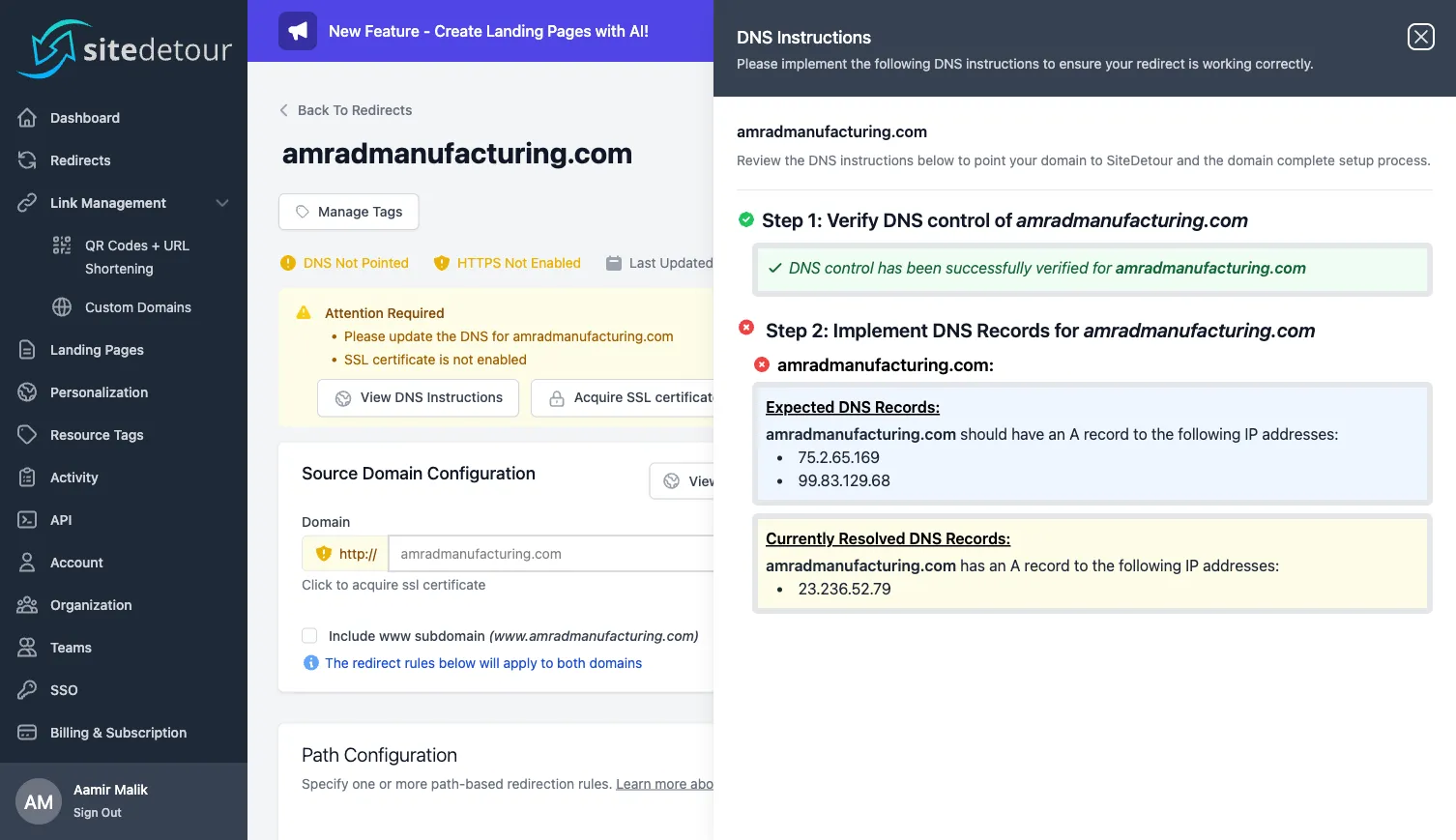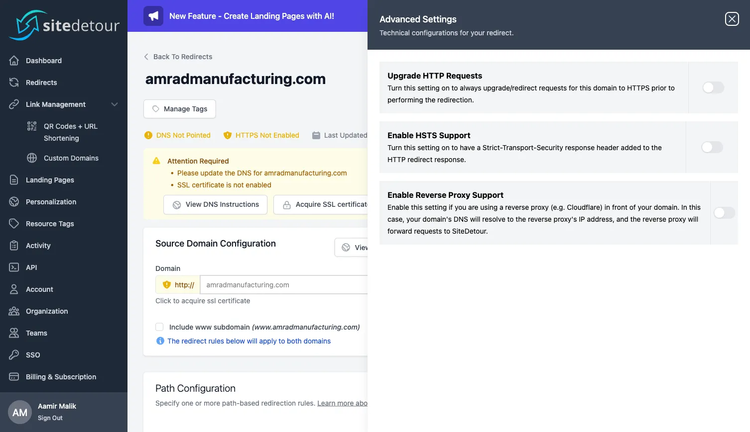 Set up a SiteDetour redirect end-to-end: create the record, configure path rules, point DNS, and acquire an SSL certificate.