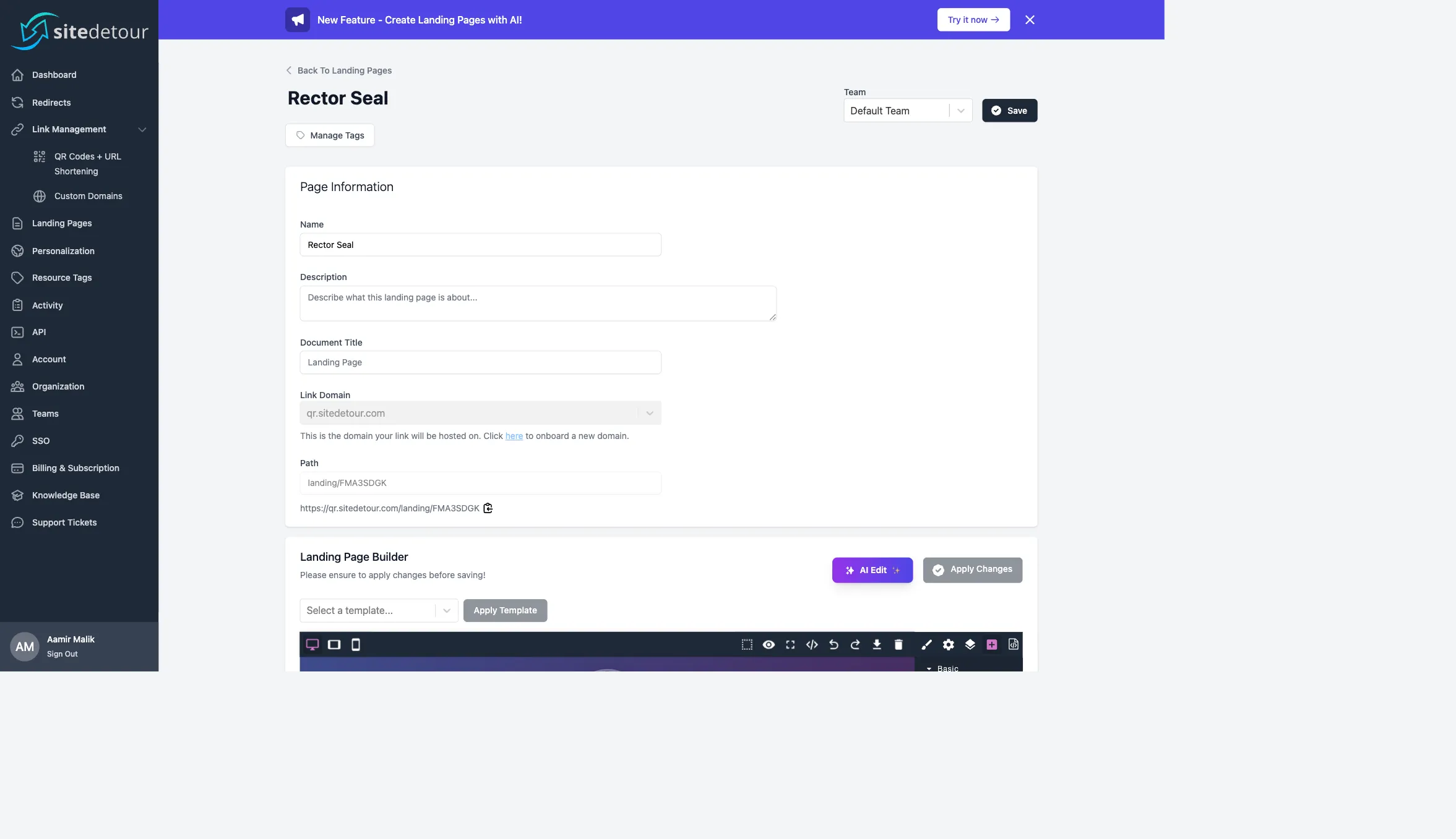 SiteDetour hosts landing pages directly on your link domains. A landing page has an HTML body, an optional document title, a slug, and a domain — and it is served at https://{link-domain}/landing/{path}. Pages are built either by hand with the drag-and-drop editor or from a prompt via the AI generator.